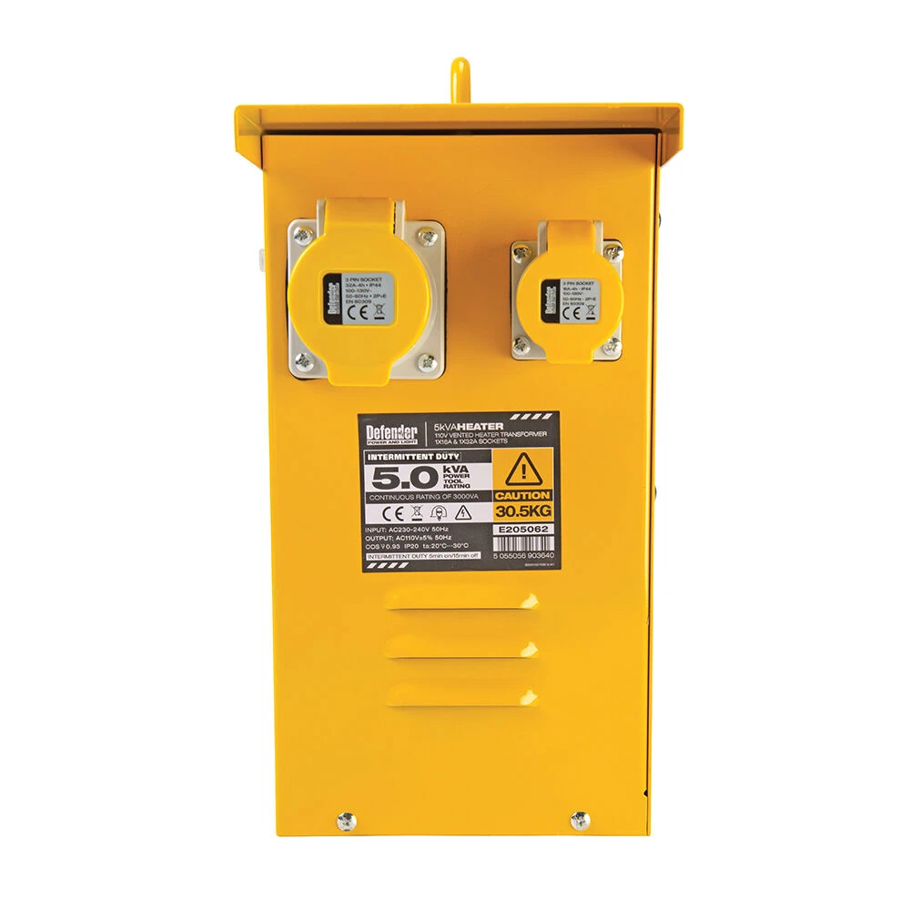 Rugged heater transformer with 1 x 16A and 1 x 32A 110V outlets and robust powder-coated metal casing. Steps down and isolates mains voltage. Runs 110V heaters including ceramic, fan and infrared. Also ideal for dehumidifiers and lights using a 16A socket. Resettable overload protection keeps tools and appliances safe while maximising work times. Centre-tapped to earth for extra safety. BSEN61558-1 compliant. Plug sold separately. Intermittent rating: 5000VA. Continuous rating: 3000VA. Duty cycle 5min on / 15min off. 1.8m rubber-sheathed H07RN-F cable with 1.5mm2 3-core conductor. Ingress protection rating: IP20.