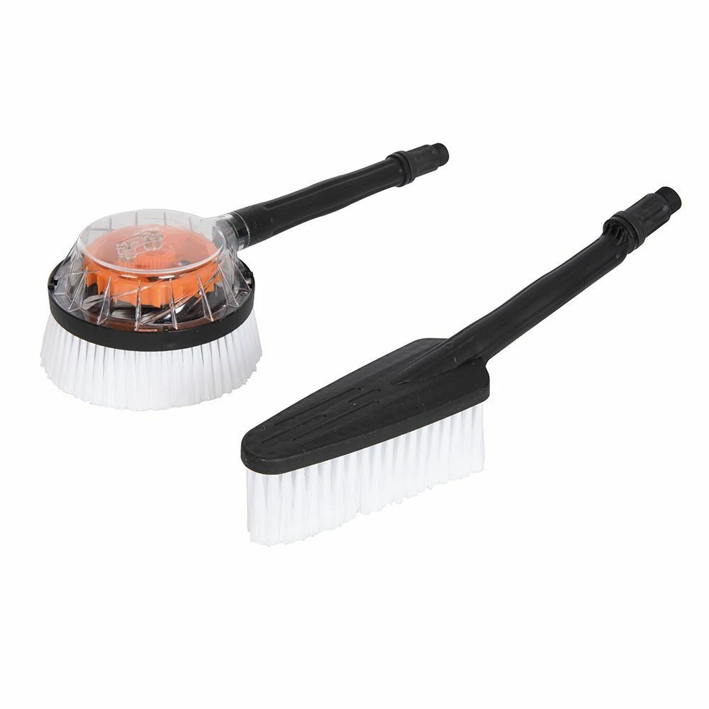 – Includes 3 x quick connect long-life brass nozzles, fixed and rotary brushes, turbo nozzle, 2-section lance, cleaning pin and water-hose quick connector.
