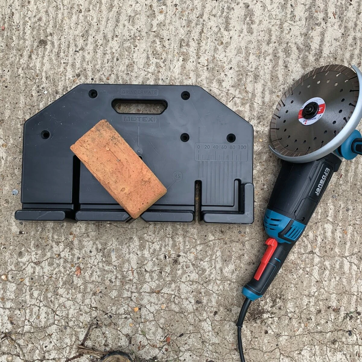 Grindermate is a simple, light cutting platform for brick and block paving which you can just grab from the van, place on the ground and start cutting! It’s marked for 45 degree and half brick cuts, and holds the brick or block pavior in place while you cut.