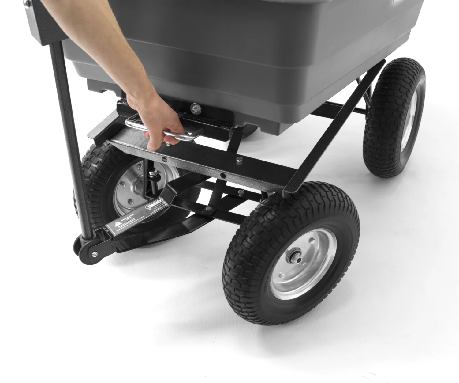 The Handy THPDC has been equipped with a dual-purpose handle – it can either be pushed or pulled; or, if you’re shifting a particularly heavy load, you can hook it up to your garden tractor (tow-hitch included).