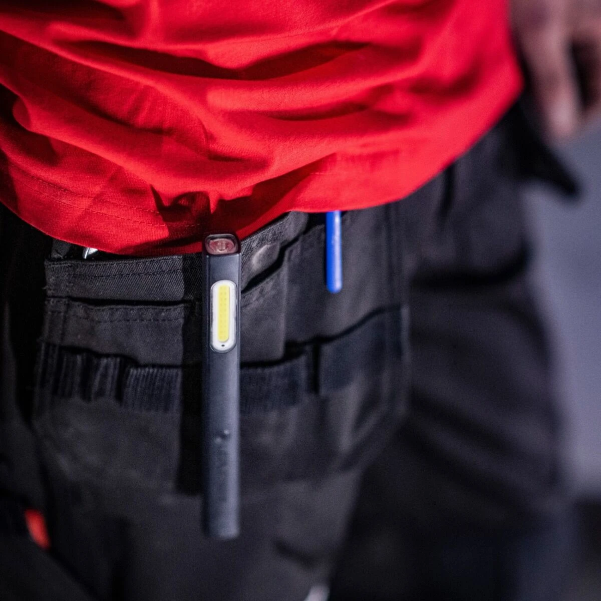 Precise light, always close at hand, the Ledlenser W2 Work is a battery powered pen and test light for trades people, construction workers and anyone in need of a reliable light in miniature format. The superior Ledlenser light quality ensures precise illumination – either via wide-area flood light or via spotlight LED in the lamp head. The W2 Work can easily be attached to breast pockets using a clip. Other clever features include a nubbed surface for a strong grip, a handy transport lock and a low battery warning function. Two AAA batteries make for a reliable and easy energy supply.