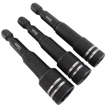 High strength Chrome Vanadium (CR-V) steel construction for tough applications. Strong, permanent magnetic pad inside the socket holder retains screw/fixing firmly in place for easy working. Set has one each of the following: 6, 8 and 10mm. All nut runners are 65mm long. Recommended for use with Impact type machines and regular drills & screw guns.