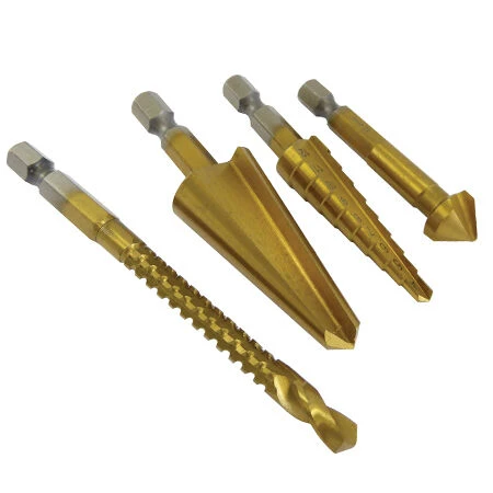 4 piece, HSS, ¼” Power Drive metal working set comprising of a 4-12mm step drill, 8-20mm step drill, 12.4mm countersink and a 6mm rotary rasp. All bits are Titanium Nitride (TiN) coated for extra wear resistance and supplied in a metal storage box. A value for money set.